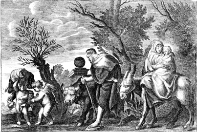 Description: Fleeing Herod and heading to Egypt, Joseph walks, while Mary and Jesus ride snugly on a donkey; cherubim squabble over carrying supplies.