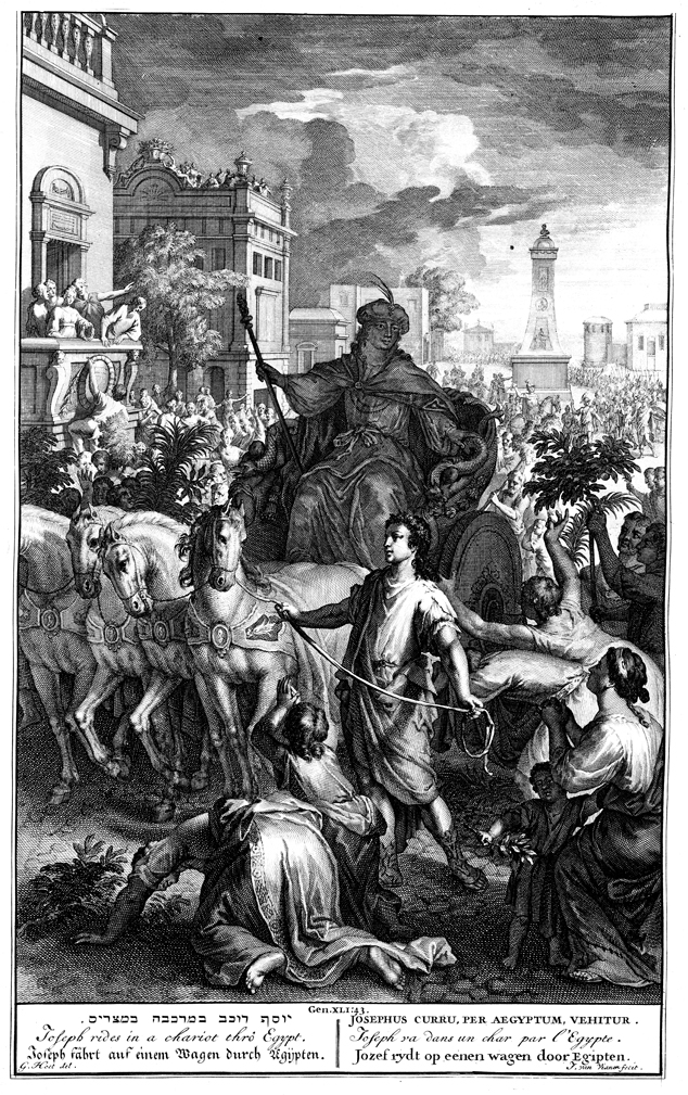 Description: Joseph rides through Egypt in a chariot. Engraved by John van Vianen (1660-1726) from the design of Gerard Hoet (1648–1733.