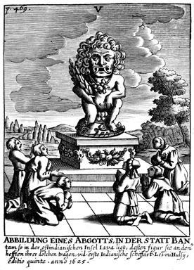 Description: People of the city of Banten, which is located on the island of Java, bow before a humanoid statue with tusks. The caption cites the 1625 book “Erste Schiffahrt In die Orientalische Indien,” edited by Levinus Hulsius (c. 1550-1606).