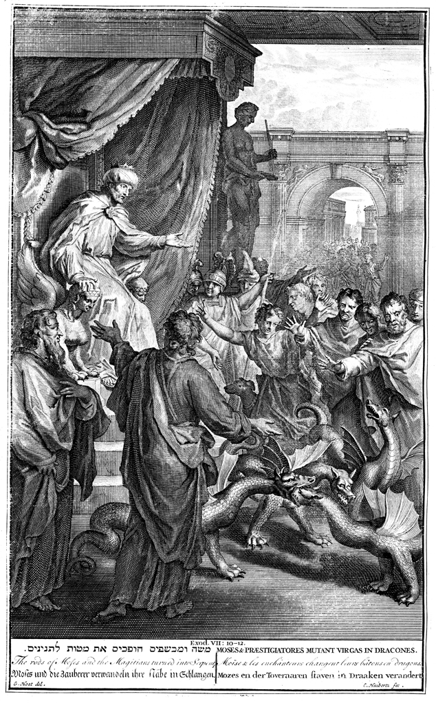 Description: Moses and Aaron turn the rods of the magicians into winged dragons. Engraved by C. Huibertz (Hubertz, Huiberts) from the design of Gerard Hoet (1648–1733).