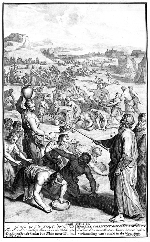 Description: Moses gestures with his staff as the Israelites gather manna into baskets and jars. Engraving by Joseph Mulder (1658 - ca. 1728) from the design of Gerard Hoet (1648–1733).