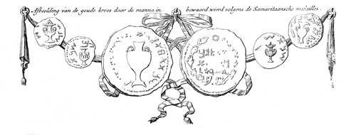 Description: A tailpiece depicting six coins with Paleo-Hebrew letters and images of jars. The inscription above reads “Pictures of the gold jars that held the manna in accordance with the Samaritan medals”.