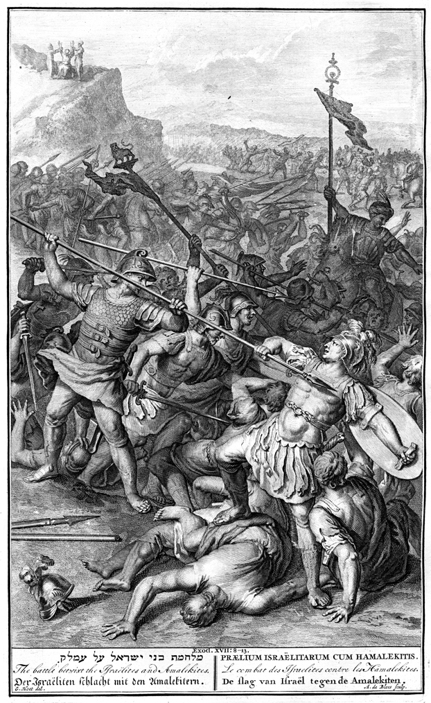 Description: The Israelites and Amalekites wage war. Engraving by Abraham de Blois (or Bloys; fl. 1690-1720) from the design of Gerard Hoet (1648–1733).