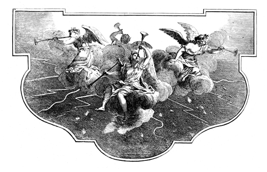 Description: A tailpiece depicting angels blowing their trumpets, atop storm clouds.