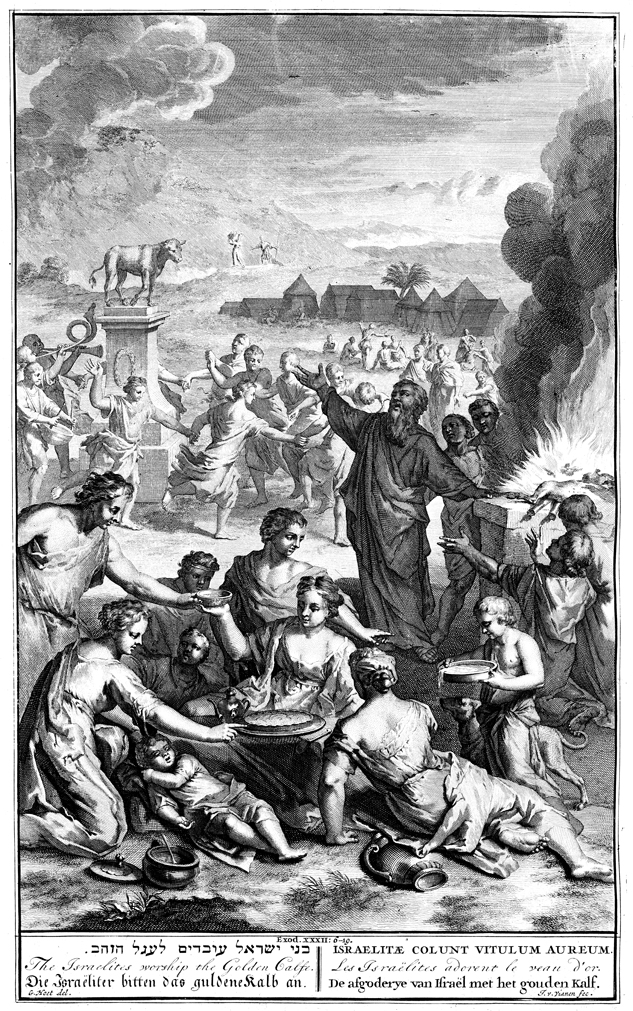 Description: Aaron stands by an altar as Israelites feast and dance around the upraised golden calf. Engraving by John van Vianen (1660-1726) from the design of Gerard Hoet (1648–1733).