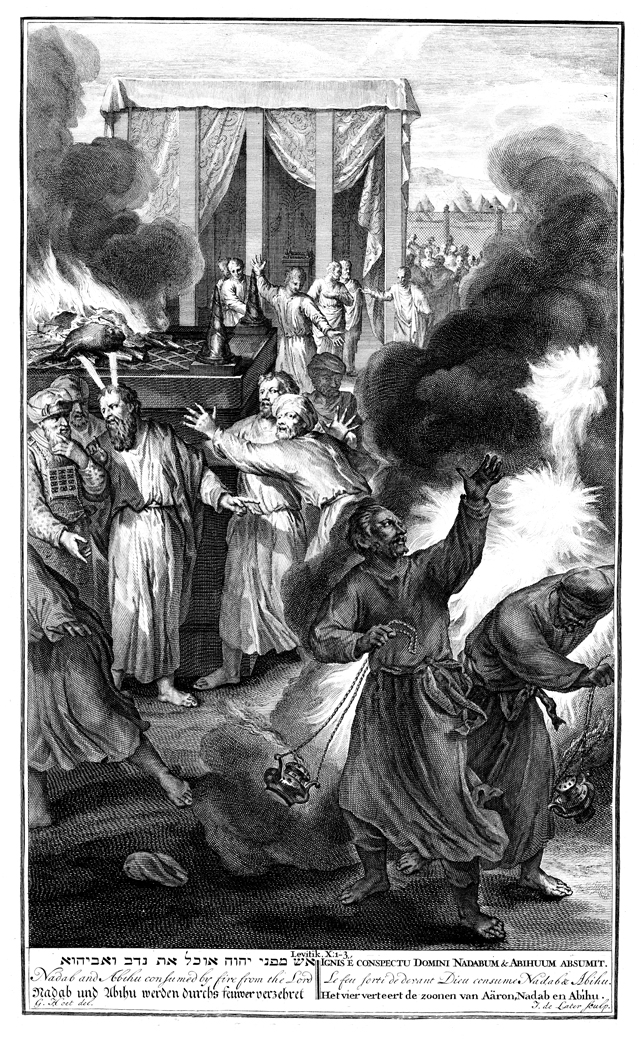 Description: God punishes Nadab and Abihu by burning them to death. Engraving by Jan de Later from the design of Gerard Hoet (1648–1733).