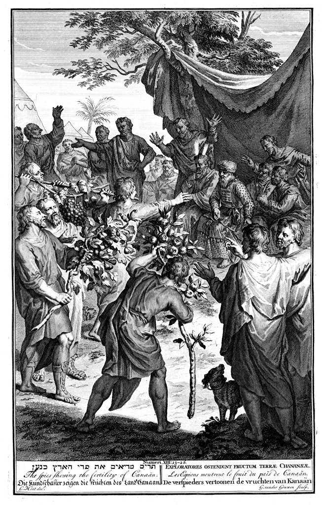 Description: Joshua and Caleb return from the exploration of Canaan with branches of fruit and display them to Moses and Aaron. Engraving by G. vander Gouwen from the design of Gerard Hoet (1648–1733).