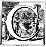 Description: An initial letter C depicting the Joshua and Caleb returning from the exploration of Canaan carrying huge bunches of grapes on a pole between them.