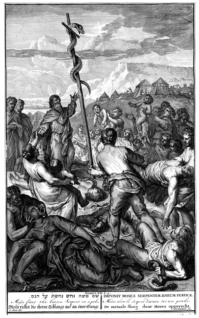 Description: Moses lifts the bronze serpent as the Israelites suffer and clutch other serpents. Engraved by C. Huiberts (Hubertz, Huibertz) from the design of Gerard Hoet (1648–1733).