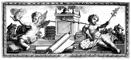 Description: A headpiece depicting an angel holding a flowering rod and another angel holding a censer, flanked by scrolls and vessels.
