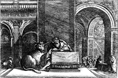 Description: Luke sits with pen in hand, accompanied by an ox; this symbol is associated with him because his gospel begins with the story of John the Baptist's priestly father, Zechariah.
