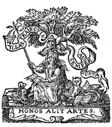 Description: The printer’s device of Anthony Smytegelt (a. 1665 – 1675) features Minerva sitting beneath an olive tree with an owl at her side. Above her is the Latin motto PALLAS TRAJECTINA SEMPER AUGUSTA meaning “the olive tree in Utrecht is always majestic” and below is the Latin phrase HONOS ALIT ARTES which means “honor fosters the arts”.