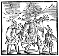 Description: Three Jewish men in flamboyant costumes run through the streets making noise to celebrate Purim.