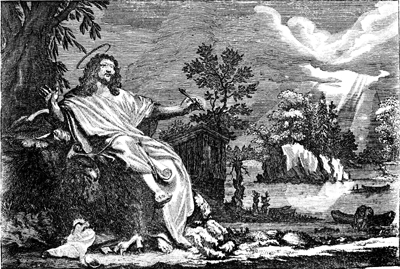 Description: St. John the Evangelist sits holding a pen and accompanied by his symbol (eagle); light from heaven is shown coming down upon this rural scene, symbolizing the divine light and revelation of Christ that is particularly important in John's gospel.