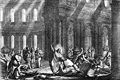 Description: An enraged Jesus drives out money changers from the temple with a whip, overturning tables and puring out coins.