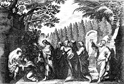 Description: Jesus stands at the entrance to Lazarus' tomb commanding him to come out, as Lazarus emerges, bundled in burial clothes.