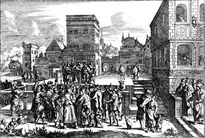 Description: With Jesus dressed in a purple robe and crown of thorns, Pilate asks a crowd of Jews whether or not Jesus should be set free or crucified.