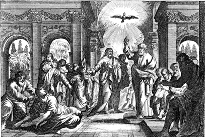 Description: After her husband, Ananias lied about bringing all his money to the apostles and fell dead, Sapphira falls back on the ground, dying, as the Holy Spirit descends at Peter's proclamation.