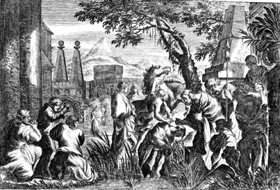 Description: As Peter arrives at Cornelius' house, Cornelius bows before Peter as others watch.