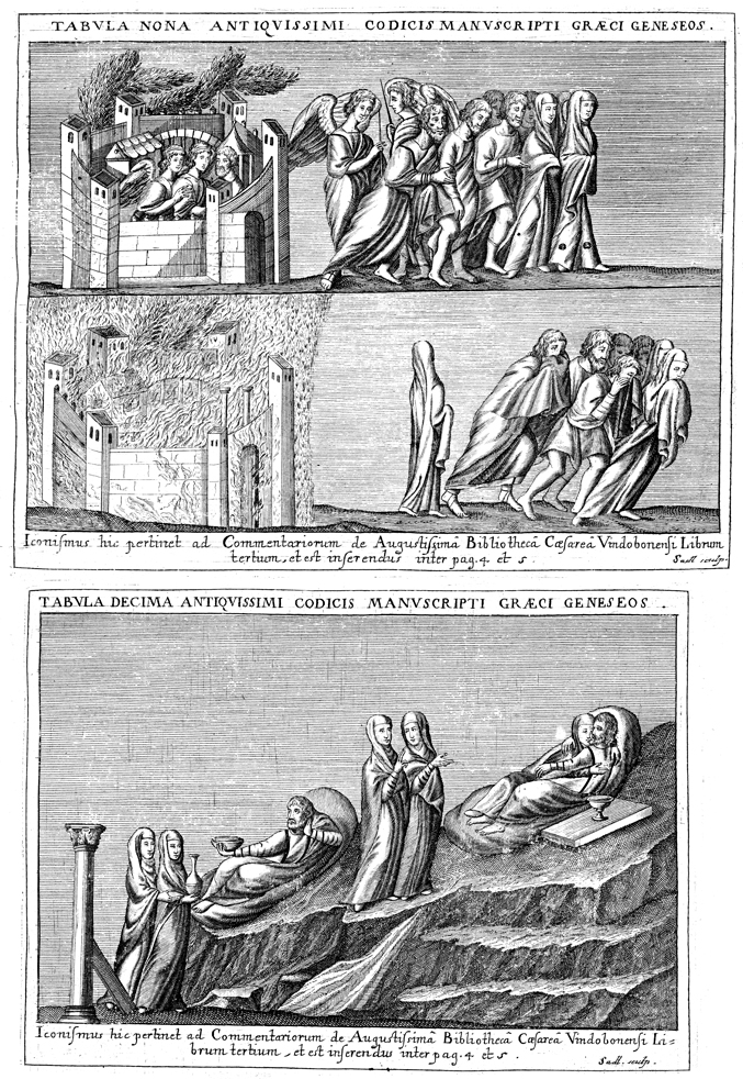 Description: In the image at the top, angels bring Lot and his family to safety as God destroys the wicked city of Sodom. However, Lot’s wife turns to a pillar of salt when she looks back. In the bottom image, Lot’s daughters give him wine and sleep with him in order to bear children and provide descendants.