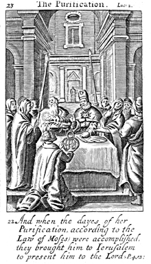 Description: Mary and Joseph present Jesus to the priests of the temple in Jerusalem. Simeon carries the child while Joseph, kneeling, offers two turtledoves, or pigeons, for a sacrifice.