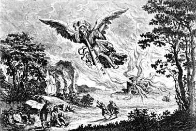 Description: After throwing a fiery, golden censor to the ground, an angel flies over some people saying, "We We We" which is German for "Incoming".