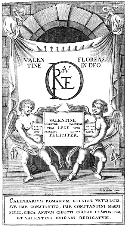 Description: This Roman calendar title-page image features two winged putti holding a sign reading VALENTINE LEGE FELICITER which means “Valentinus, enjoy reading this.” Behind them is a banner reading VALENTINE FLOREAS IN DEO which means “Valentinus, may you live long and flourish”.