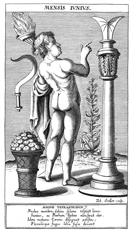 Description: A nude young man holding a torch stands beside a sickle, a basket of fruits, and a column.