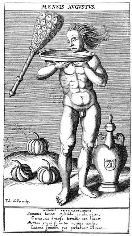 Description: A nude man holding a platter stands next to a peacock-feathered scepter. At his feet are several pumpkins and an urn.