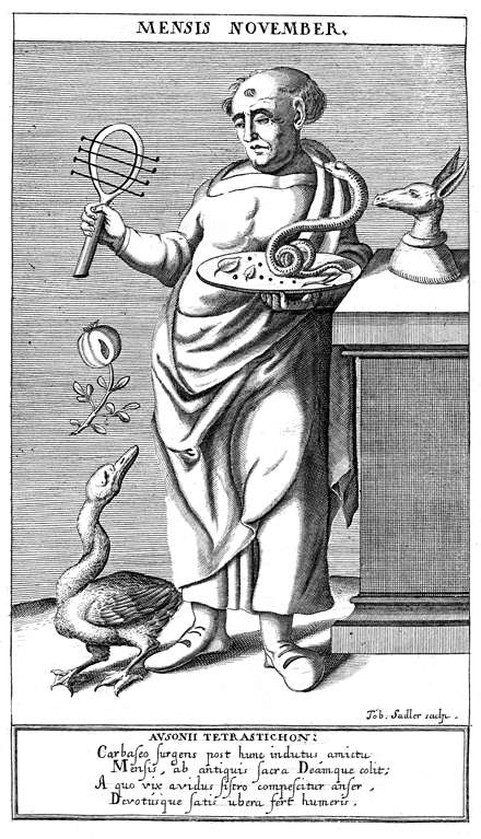 Description: A robed man holds a sistrum and plate containing a serpent. Beside him are the head of an antelope, a pomegranate, and a duck.