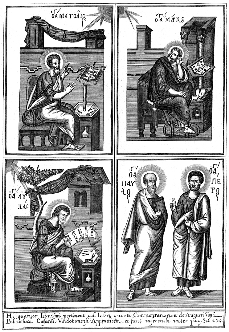 Description: The image in the top left depicts Matthew the Apostle writing his Gospel. The image in the top right shows Mark the Evangelist writing his Gospel, and the image in the bottom left features Luke the Evangelist writing his book. The image in the bottom right shows St. Paul and St. Peter.