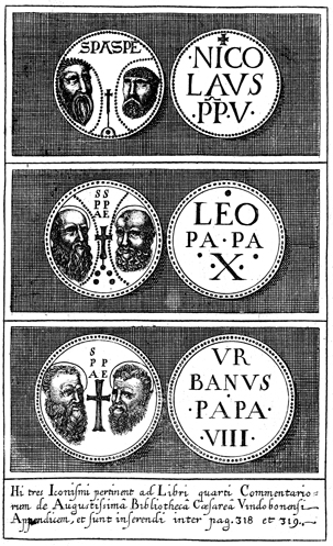 Description: Starting from the top: the papal coins of Pope Nicholas V (r. 1447 – 1455), Pope Leo X (r. 1513 – 1521), and Pope Urban VIII (r. 1623 – 1644).