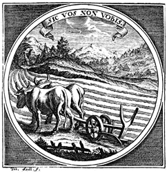 Description: The printer’s device of Austrian bookseller Matthaus Cosmerovius (1606 – 1674) features two oxen pulling a plow with the Latin motto SIC VOS NON VOBIS which means “thus do ye, but not for yourselves”.