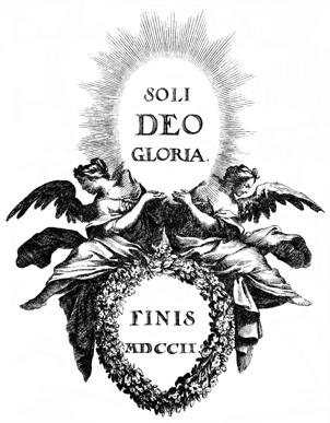 Description: Ornamental end piece containing angels holding a Latin inscription "Soli Deo Gloria".