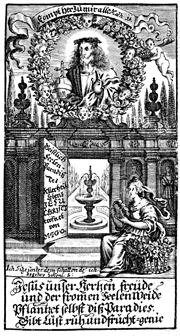 Description: This historiated title-page border features a woman sitting beside a basket of flowers and a fountain with Jesus holding a globus cruciger above.