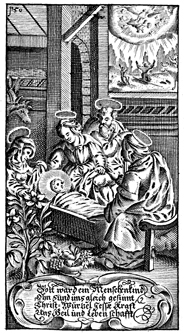 Description: Jesus is born in the stable as a host of angels appears to the shepherds in the field.