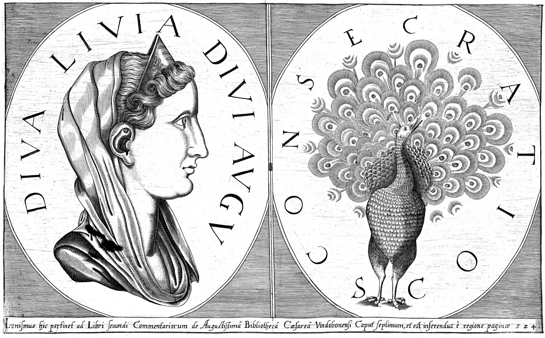 Description: The first face of this Roman coin features Livia Drusilla (58 BC – 29 AD), the wife of Augustus, and the inscription DIVA LIVIA DIVI AUGU indicating her deification. The second face depicts a peacock with the Latin word CONSECRATIO which means “consecration”.