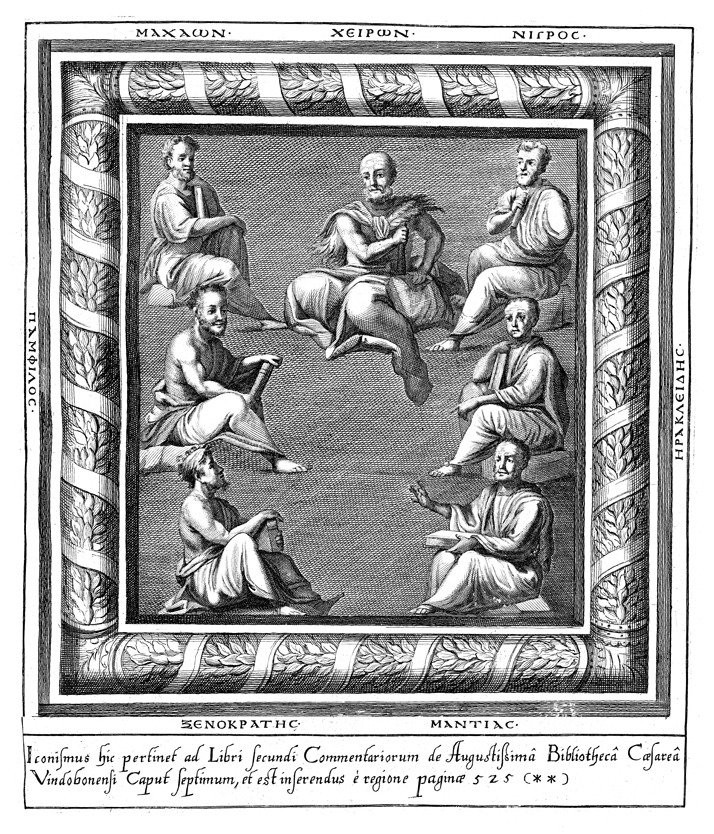 Description: Gathering of Greco-Roman scholars including Machaon, Sextius Niger, Pamphilus, Heraclides, Chiron, Xenocrates, and Mantiac.