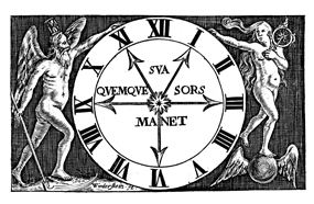 Description: Father Time stands to the left of a clock with five hands. To the right stands the goddess Fortuna atop a winged sphere.