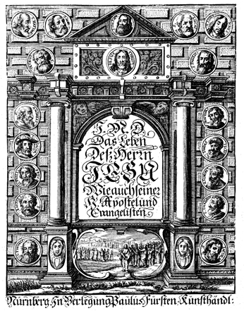 Description: This architectural title-page border features an image of Jesus at the top with two columns and images of various disciples and apostles on either side. At the bottom is a depiction of Jesus leading his disciples.