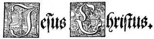 Description: The initial letter J depicts the crucifixion with Jesus hanging on the cross between the two thieves. The initial letter C features Adam and Eve eating the forbidden fruit.
