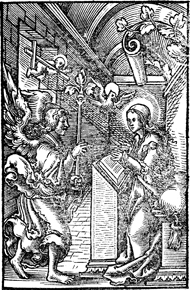 Description: The archangel Michael sits at the entrance to heaven with a book while another angel guards the way. A putti above carrying a cross indicates the salvation brought by the crucifixion.