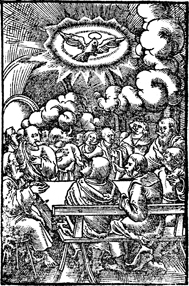 Description: A depiction of the Holy Spirit in the form of a dove being sent from heaven into the disciples.