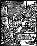 Description: Three men work at a table while two others attempt to sneak through a door.