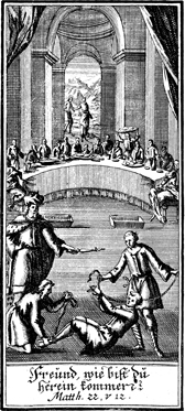 Description: In the Parable of the Wedding Banquet, the king casts out a guest who came without wedding clothes.