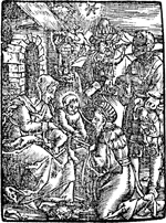 Description: Three Magi from the East follow a great star in the sky to the home of Jesus and his family after Jesus' birth. Upon their arrival they present gifts of gold, frankincense, and myrrh to the child.