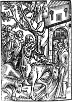 Description: Jesus rides into Jerusalem on a donkey to the waving of palm branches.