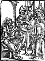 Description: Knowing that he would have to order Jesus' crucifixion in order to prevent a riot, Pilate washes his hands in front of the crowd and says to them, "I am innocent of this man's blood; see to it yourselves".