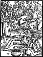 Description: A man nails Jesus' hand to the cross as the crowd watches from a distance.