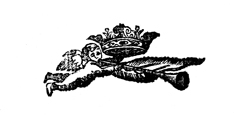 Description: This printer’s ornament of an unknown printer features a cherub or putto blowing a long horned instrument. The cherub or putti’s arms are extended toward a large feather and a royal crown slightly above its head.